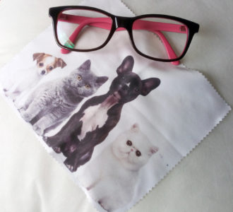 con l’applicazione di etichette ricamate, bottoncini incisi, panni tergi occhiali stampati